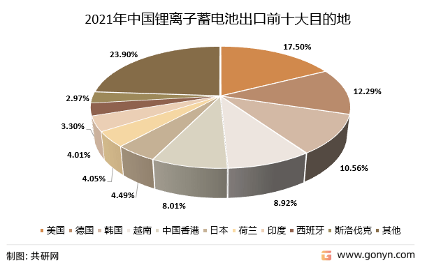 其间,锂离子蓄电池出口至美国49.75亿美元,占比17.50%;出口至德国34.93亿美元,占比12.29%;出口至韩国30.03亿美元,占比10.56%;出口至越南25.35亿美元,占比8.92%;出口至我国香港22.78亿美元,占比8.01%。