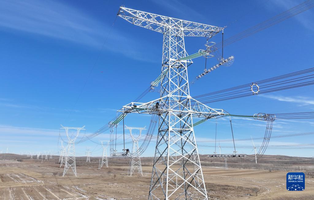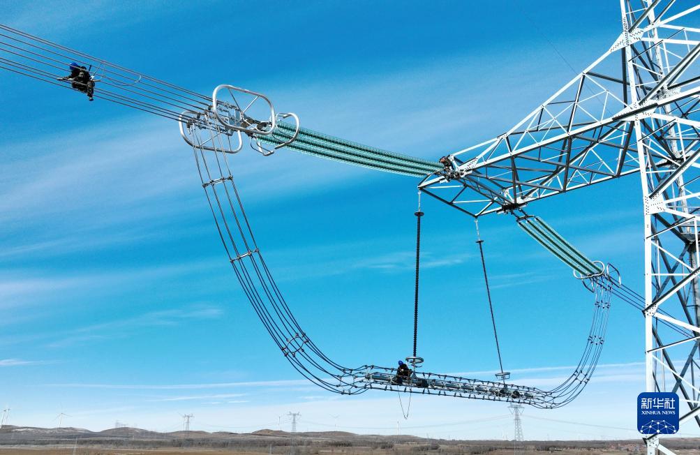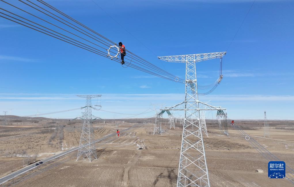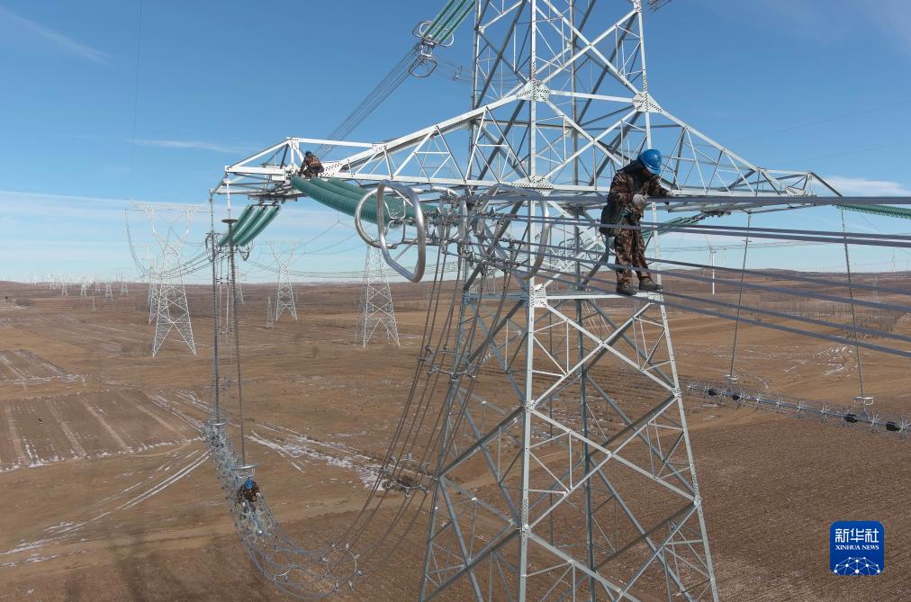 11月10日,北京送变电有限公司的工人在河北省康保县丹清河乡境内的张北至成功双回1000千伏特高压线路工程冀北段建造工地施工(无人机相片)。 近来,由北京送变电有限公司承建的张北(河北省张家口市张北站)至成功(内蒙古锡林郭勒盟成功站)双回1000千伏沟通线路工程冀北段建造进入收尾阶段。据介绍,该工程是国家“十四五”规划的重点项目,投产后,每年将向京津冀区域和山东、江苏等省市运送绿色电能约700亿千瓦时,逐步增强内蒙古锡盟和河北张家口的风电、光伏等新动力外送才能,提高区域电网保供才能。 新华社记者 杨世尧 摄
