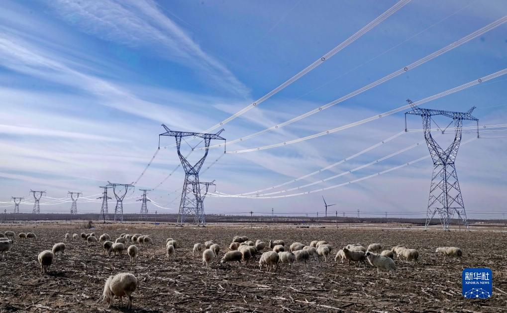 11月10日,一群羊在河北省康保县丹清河乡境内的张北至成功双回1000千伏特高压线路工程冀北段建造工地邻近寻食。 新华社记者 杨世尧 摄