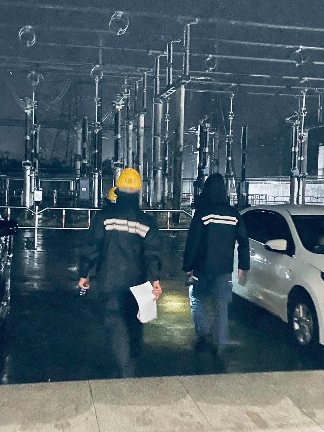 海口变电分公司运转人员冒雨进行毛病排查和设备查看(央广网发 吕博睿 摄)
