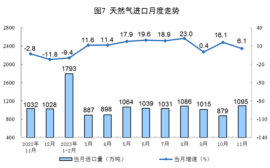 1—11月份,生产天然气2096亿立方米,同比增长6.0%。进口天然气10740万吨,同比增长8.5%。